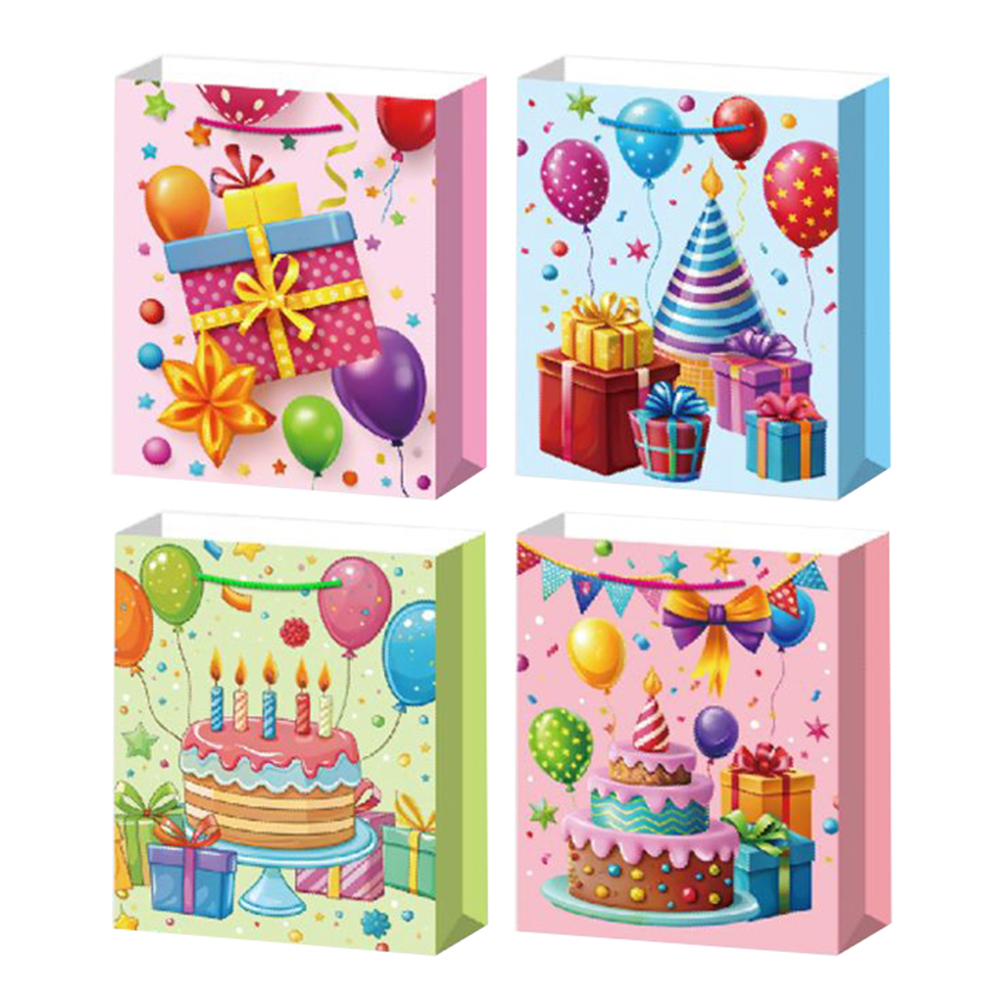 Papier Tragetasche "Happy Birthday" mit Geburtstags Motiven mit Glitter 4-fach sort. 26 x 10 x 32 cm