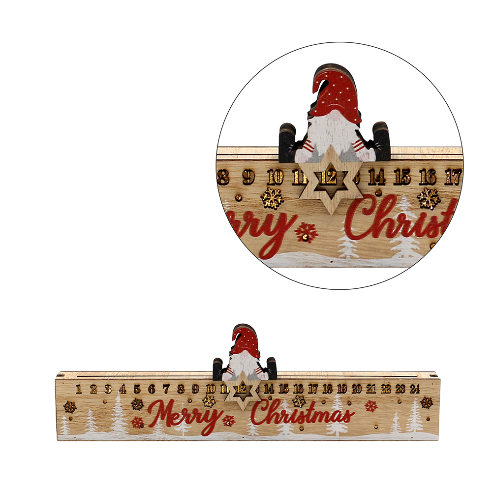 Holz Adventskalender beleuchtet "Merry Christmas" mit schiebbarem Wichtel 25 x 2,5 x 7,5 cm Batteriebetrieb AAA; LED; 6h-Timer;