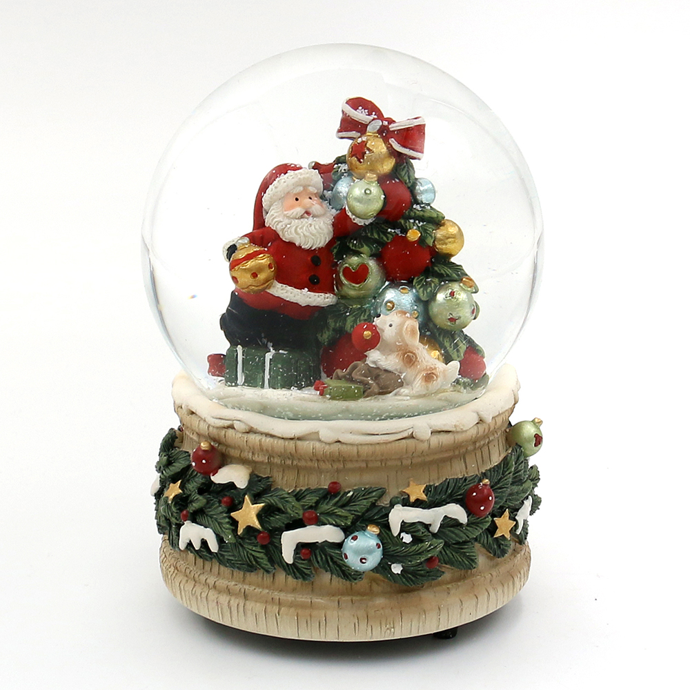 Polyresin Schneekugel "Weihnachtsmann am Tannenbaum mit Kugeln" auf edel verziertem Sockel 10 x 10 x 14,5 cm Ø 10 cm Spielwerk We wish you a merry Christmas;
