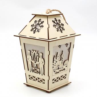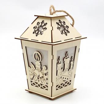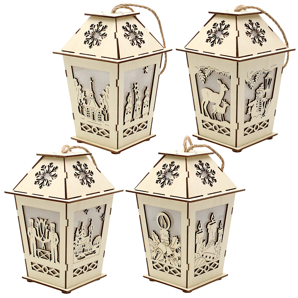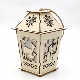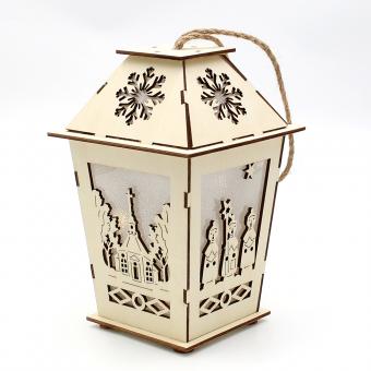 Holz Laterne natur mit Anhänger mit verschiedenen Motiven 4-fach sort. 12,5 x 12,5 x 19,5 cm Batteriebetrieb AAA; LED; 6h-Timer;