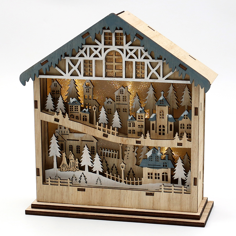 Holz Haus mit Stadt Szene bunt 18,5 x 7 x 20 cm Batteriebetrieb AAA; LED; 6h-Timer;