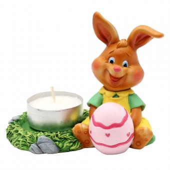 Polyresin Rabbit "Happy" with egg, sitting with tealight holder, colorful 2-asst 11 x 6,5 x 9 cm