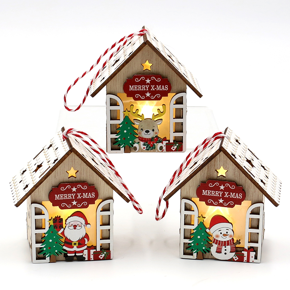 Wooden Colorful lantern "House with Santa, Snowman, Elk" with hanger 3-asst 7,5 x 5,5 x 8 cm LED;