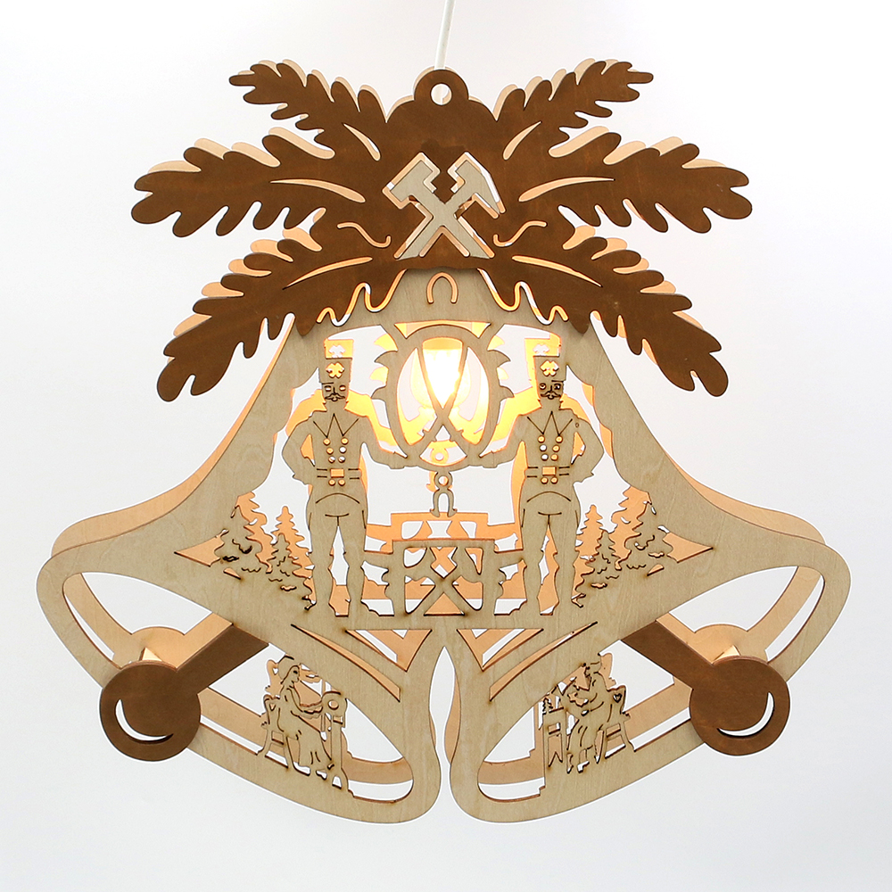 Wooden Window decoration "Double bell/Miner motif" with brown appliqués (laser-cut wood) 29,5 x 5 x 28 cm 230 V cable; E14; E14;