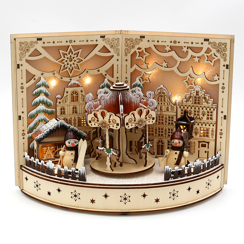 Wooden Book "City Scene with Carousel" with snowman figures (laser-cut wood) 30 x 14,5 x 22 cm battery operation AAÿÿ; LED; movement;