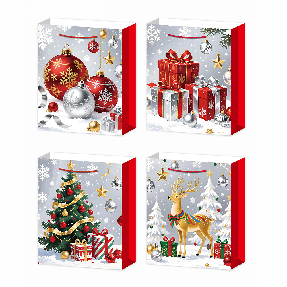 Paper Tote bag with Christmas motifs, red/silver with glitter 4-asst 26 x 10 x 32 cm