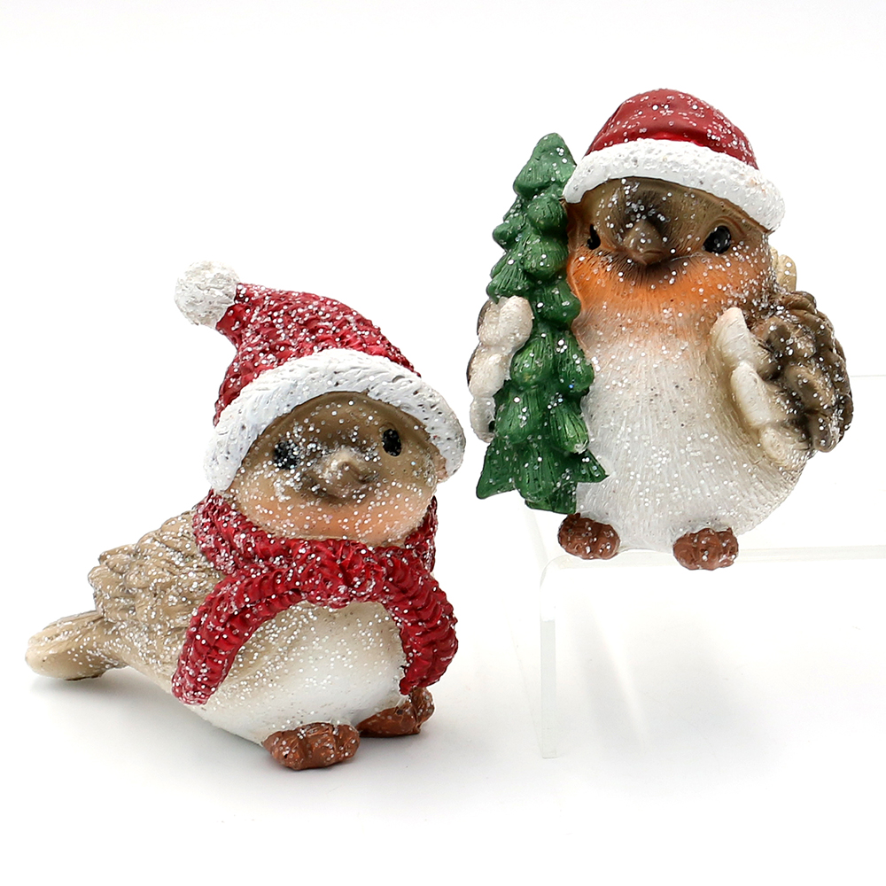 Polyresin Birds wearing a Santa hat and scarf, with glitter 2-asst 8 x 11 x 10 cm