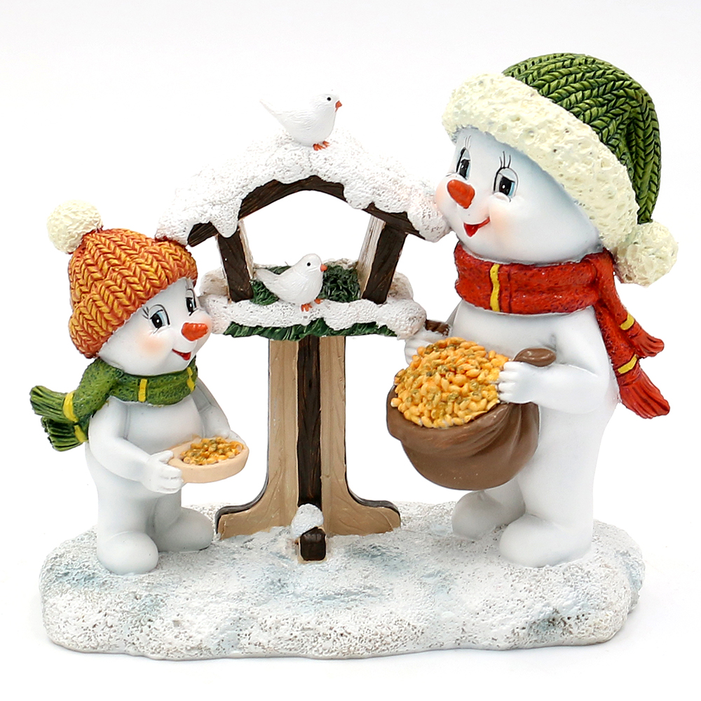 Polyresin Snow children with hat and scarf orange/green "bird feeding" 6 x 5 x 11,5 cm