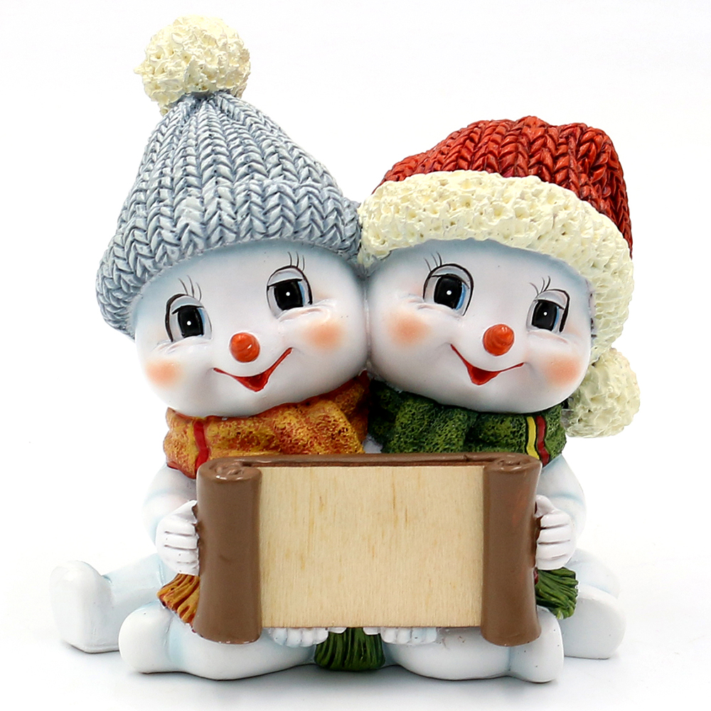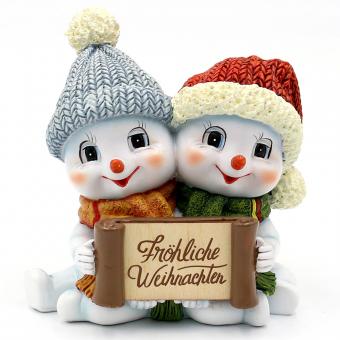 Polyresin Snow child couple with hat and scarf grey/red with interchangeable label for self-labeling 11 x 7,5 x 11 cm