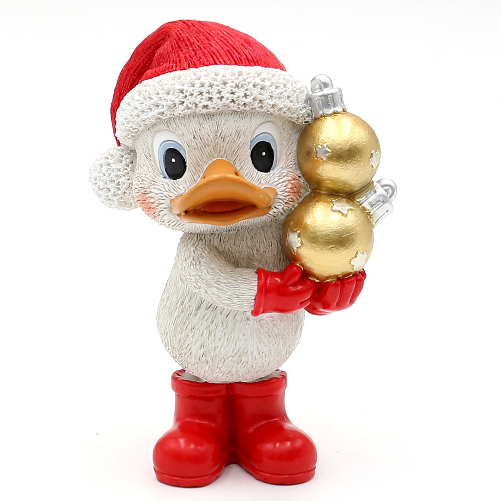 Polyresin Duck with a Santa hat, red boots, and golden Christmas baubles 9 x 7 x 14 cm
