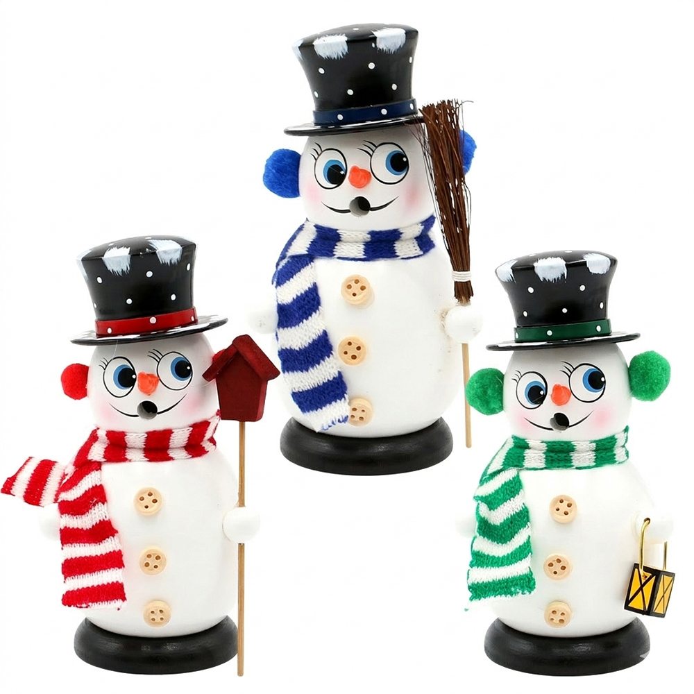 Wooden Smoking snowman "Bobby" with knitted scarf r/w, bl/w, gr/w 3-asst 8 x 8 x 16 cm